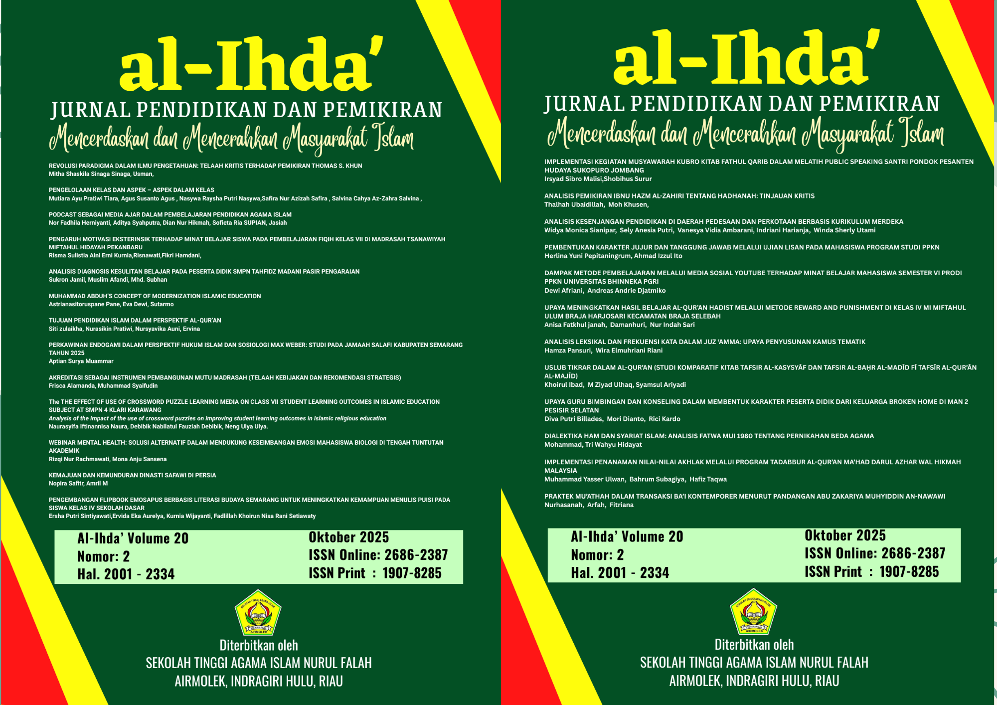 Vol. 20 No. 2 (2025)is Jurnal Electronic which contains the results of research and literature studies related to the field of education, learning activities, learning strategies, teacher professionalism, students, education and education personnel, issues of educational institutions, educational environment and parenting. Al-Ihda': Jurnal Pendidikan dan Pemikiran is an National peer-reviewed journal dedicated to interchange for the results of high quality research in all aspect of education and teaching. The journal publishes state-of-art papers in fundamental theory, experiments and simulation, as well as applications, with a systematic proposed method, sufficient review on previous works, expanded discussion and concise conclusion. As our commitment to the advancement of education and teaching, the Al-Ihda': Jurnal Pendidikan dan Pemikiran follows the open access policy that allows the published articles freely available online without any subscription.