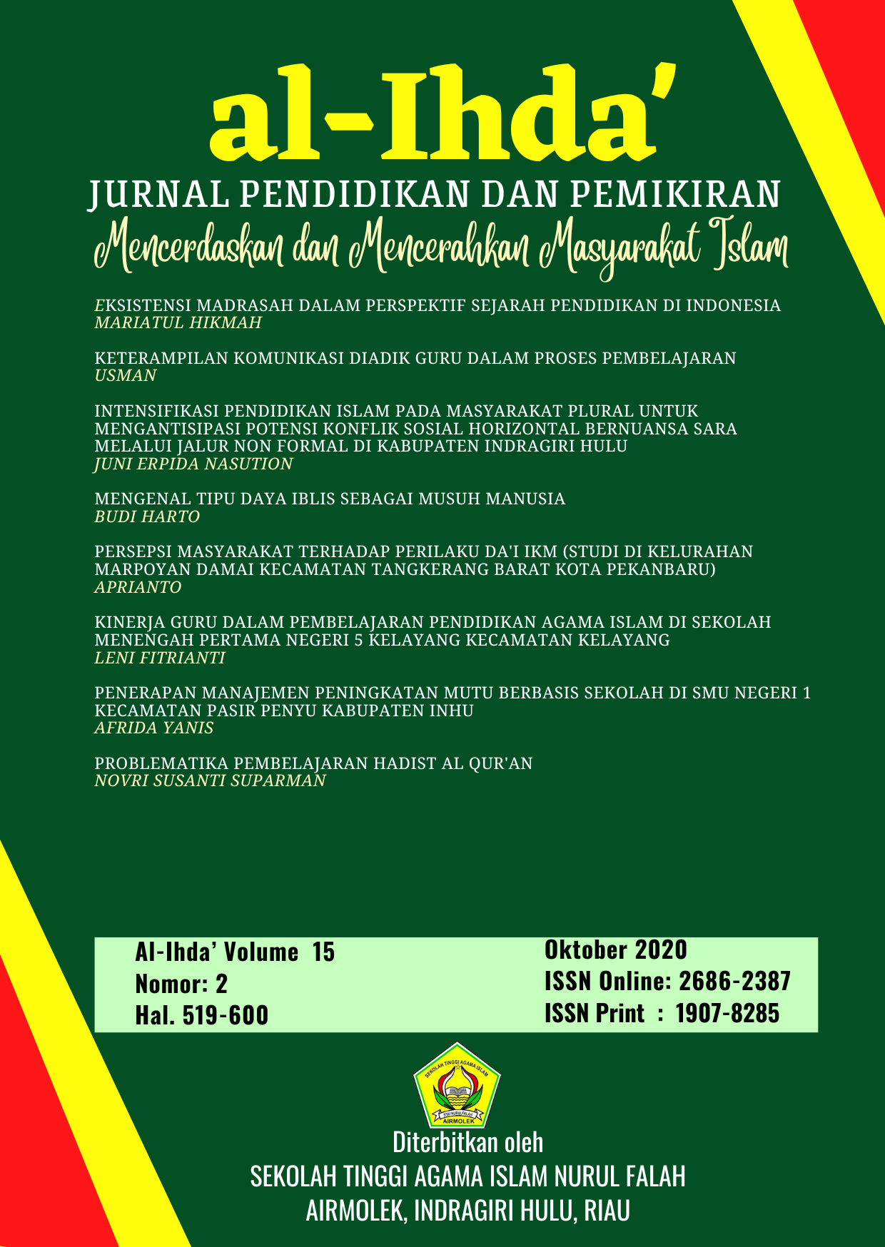 Vol. 15 No. 2 (2020)Al-Ihda': Jurnal Pendidikan dan Pemikiran is Jurnal Electronic which contains the results of research and literature studies related to the field of education, learning activities, learning strategies, teacher professionalism, students, education and education personnel, issues of educational institutions, educational environment and parenting. Al-Ihda': Jurnal Pendidikan dan Pemikiran is an National peer-reviewed journal dedicated to interchange for the results of high quality research in all aspect of education and teaching. The journal publishes state-of-art papers in fundamental theory, experiments and simulation, as well as applications, with a systematic proposed method, sufficient review on previous works, expanded discussion and concise conclusion. As our commitment to the advancement of education and teaching, the Al-Ihda': Jurnal Pendidikan dan Pemikiran follows the open access policy that allows the published articles freely available online without any subscription.